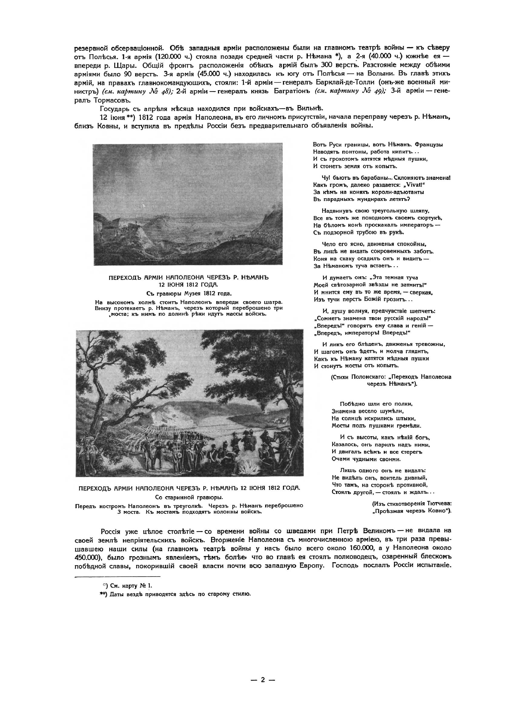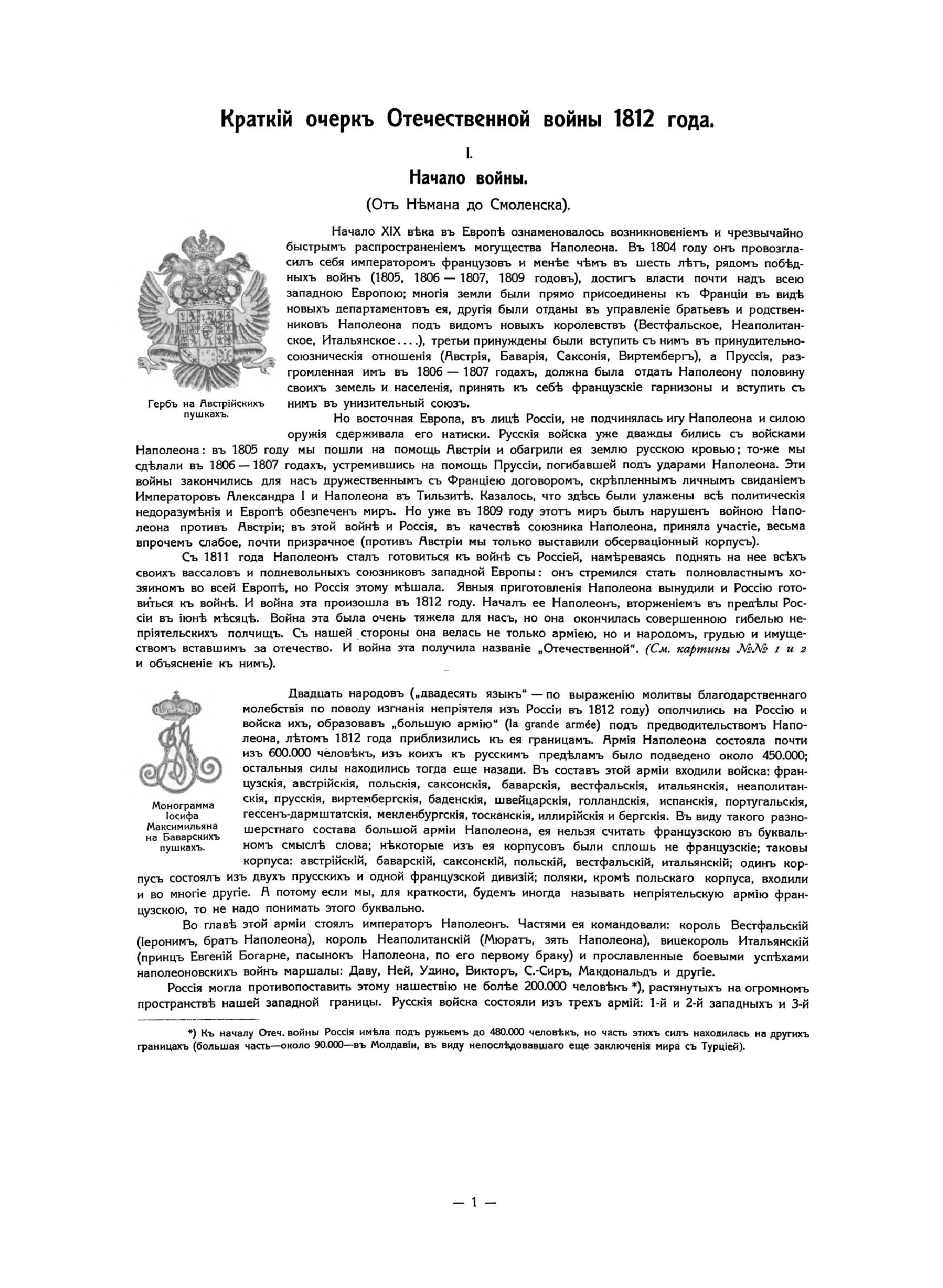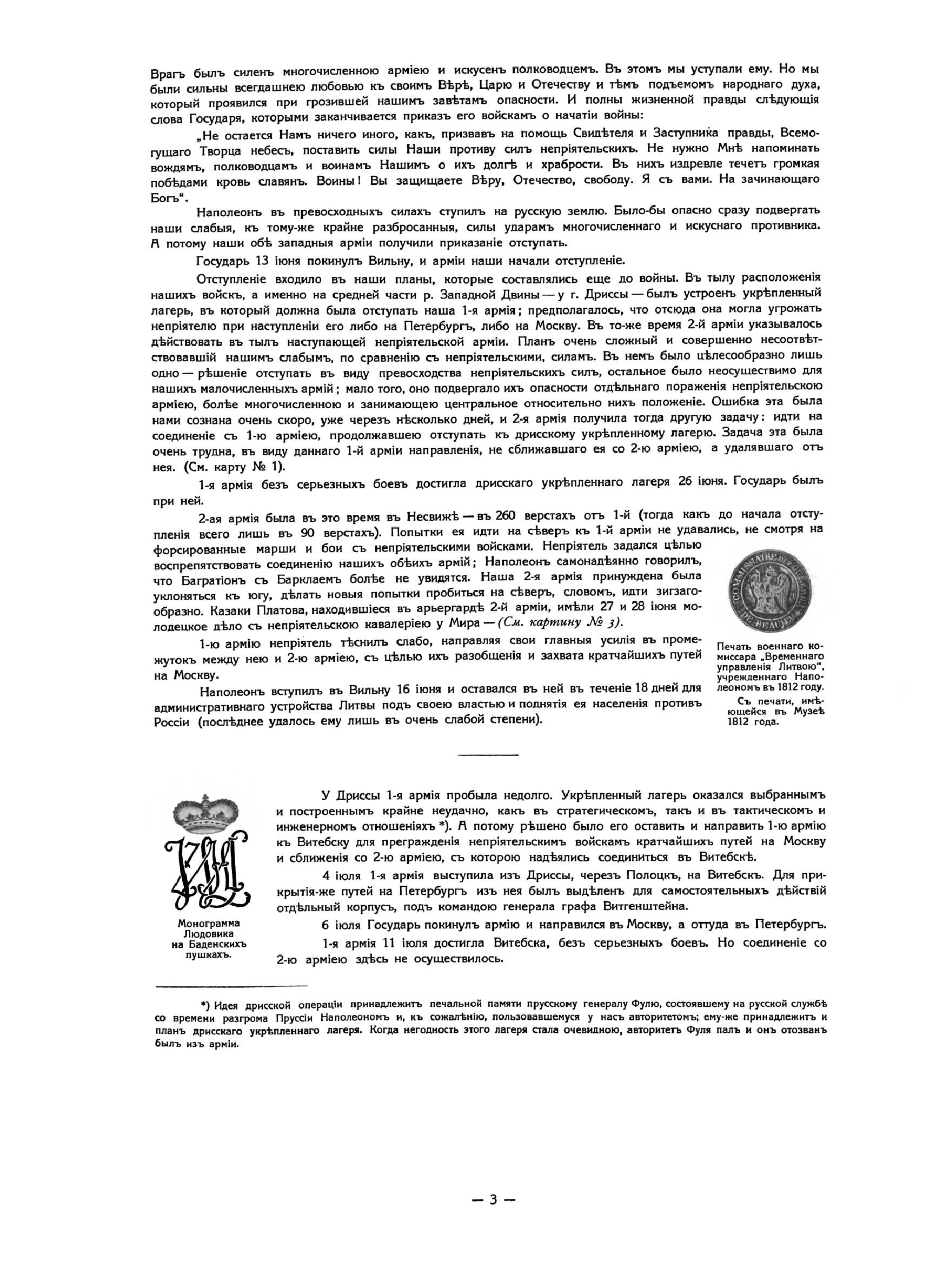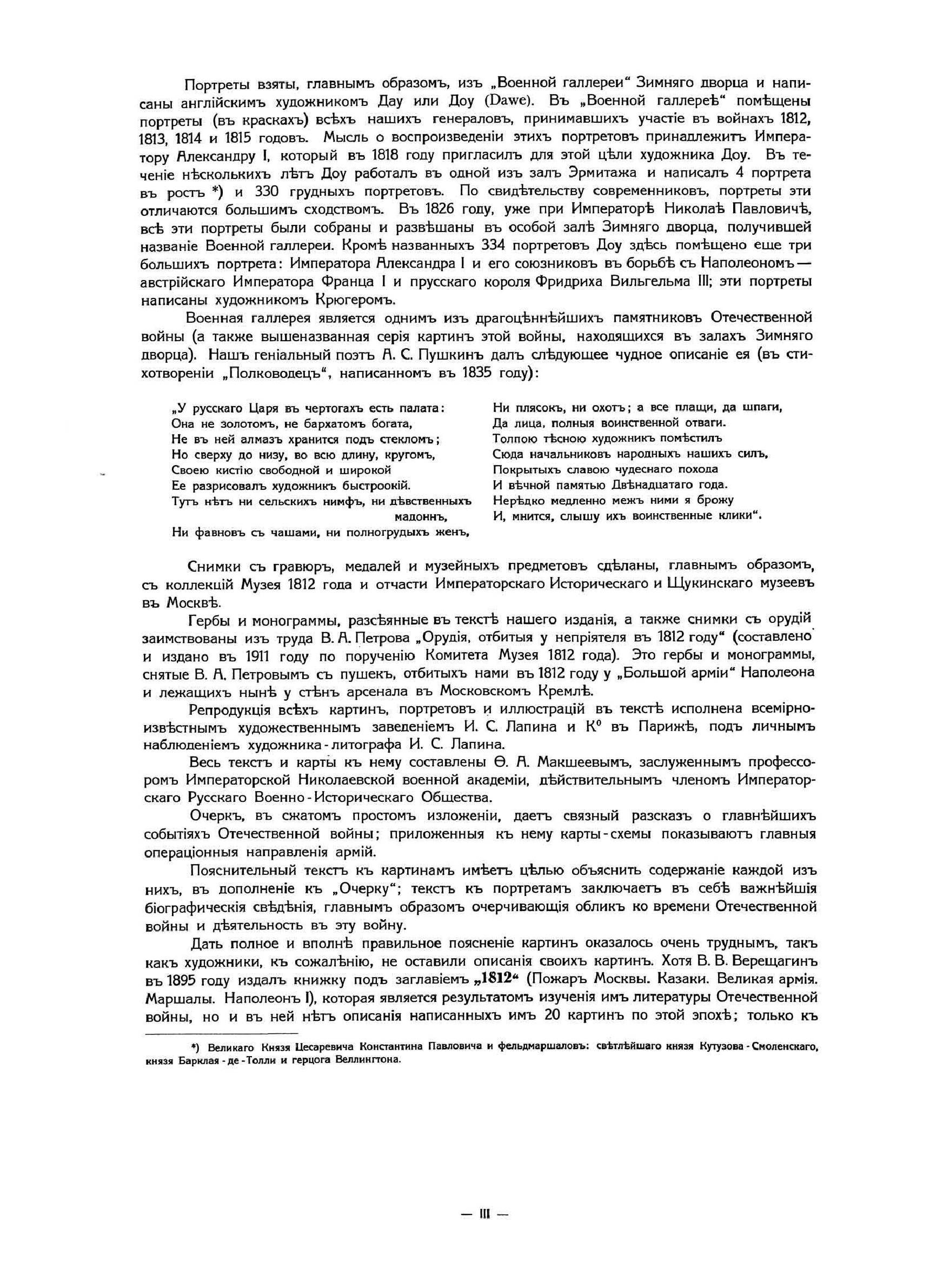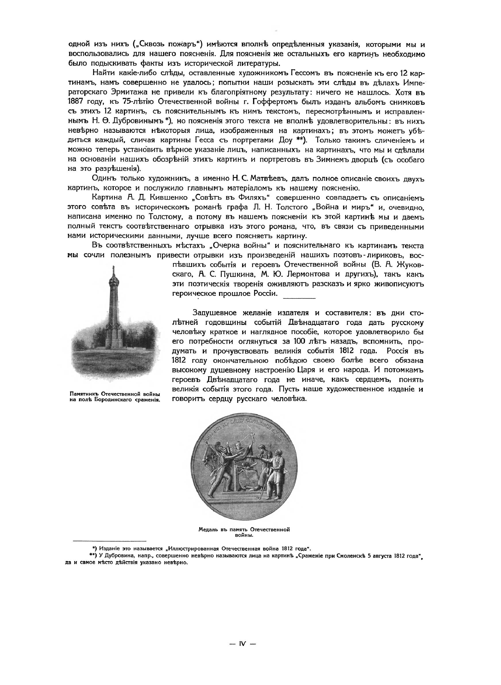 За вѣру, царя и отечество. Отечественная война 1812 г. въ картинахъКнига издана в Париже в 1912 году к столетию Отечественной войны 1812 года. Издание состоит из собрания картин и портретов. Все картины (43) в красках, часть портретов (18) тоже в красках, остальные (23) черно-белые. Каждая картина напечатана на отдельном листе, шесть больших портретов напечатаны тоже на больших листах. Остальные портреты (35) сгруппированы по четыре на листе, и один лист имеет семь портретов. Все картины и портреты снабжены пояснительным текстом, напечатанным на прозрачной бумаге, и принадлежат кисти известных художников. Это собрание предваряет краткий очерк Отечественной войны с девятью картами-схемами и иллюстрациями. 84 иллюстрации представляют собой снимки со старинных гравюр и изданий, некоторых музейных предметов, гербов, монограмм и пр. В своей работе издатель и составитель руководствовались одним «задушевным желанием»: дать русскому человеку краткое и наглядное пособие, которое предоставило бы ему возможность оглянуться на сто лет назад, вспомнить, продумать и прочувствовать великие события 1812 года. «Россия в 1812 году окончательной своей победой более всего обязана высокому душевному настроению царя и его народа. И потомкам героев 1812 года не иначе как сердцем понять великие события этого года. Пусть это художественное издание и говорит сердцу русского человека».