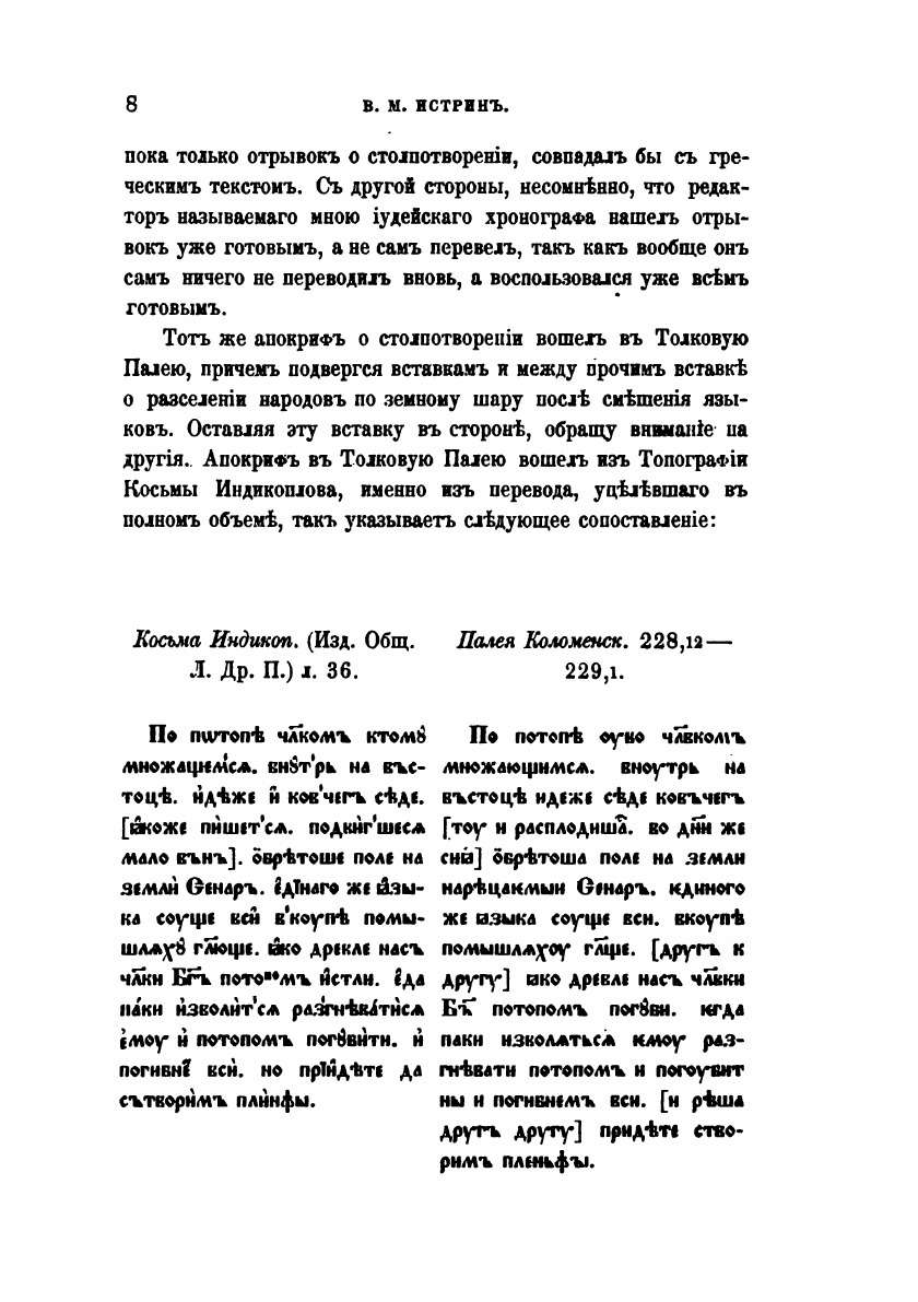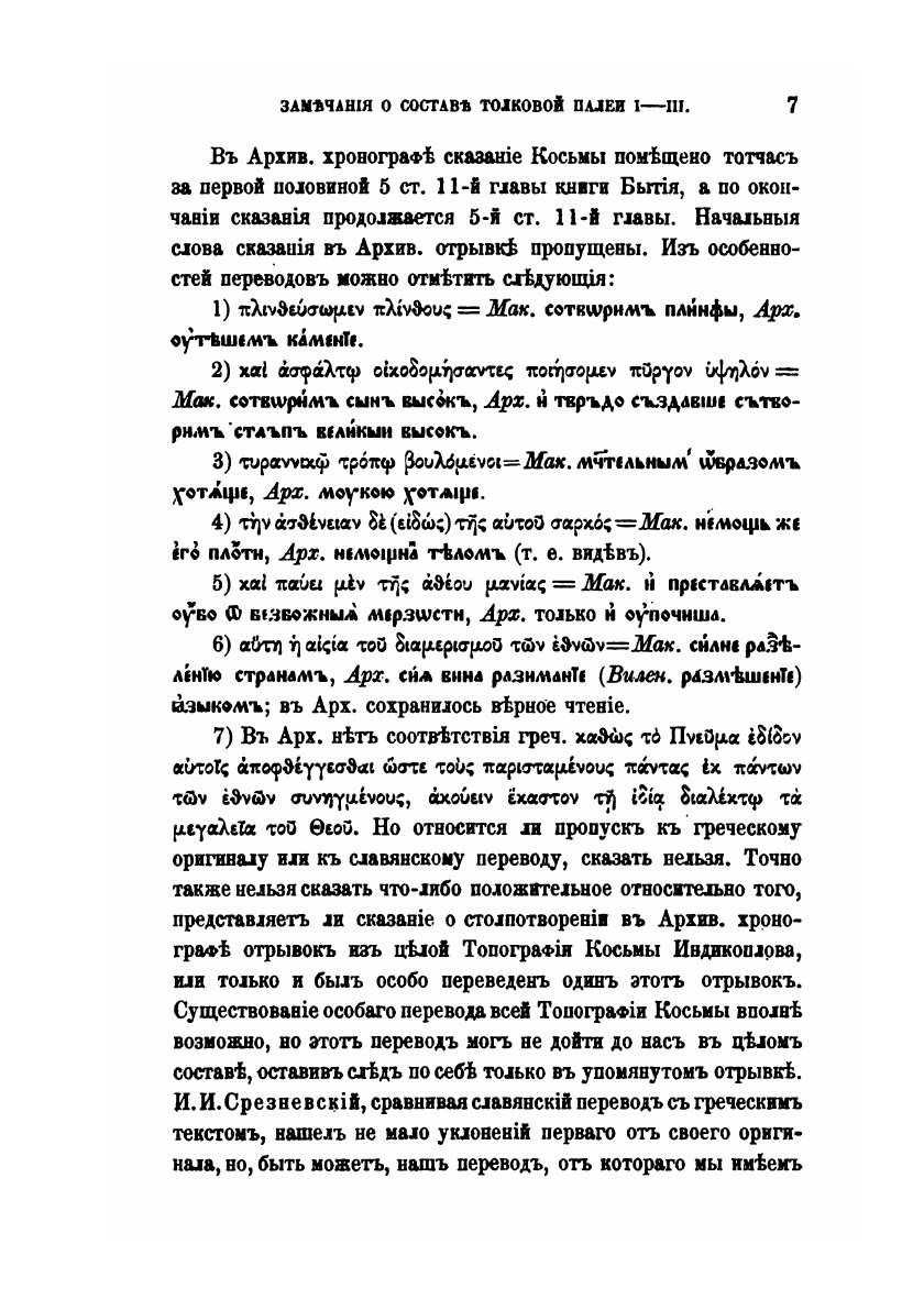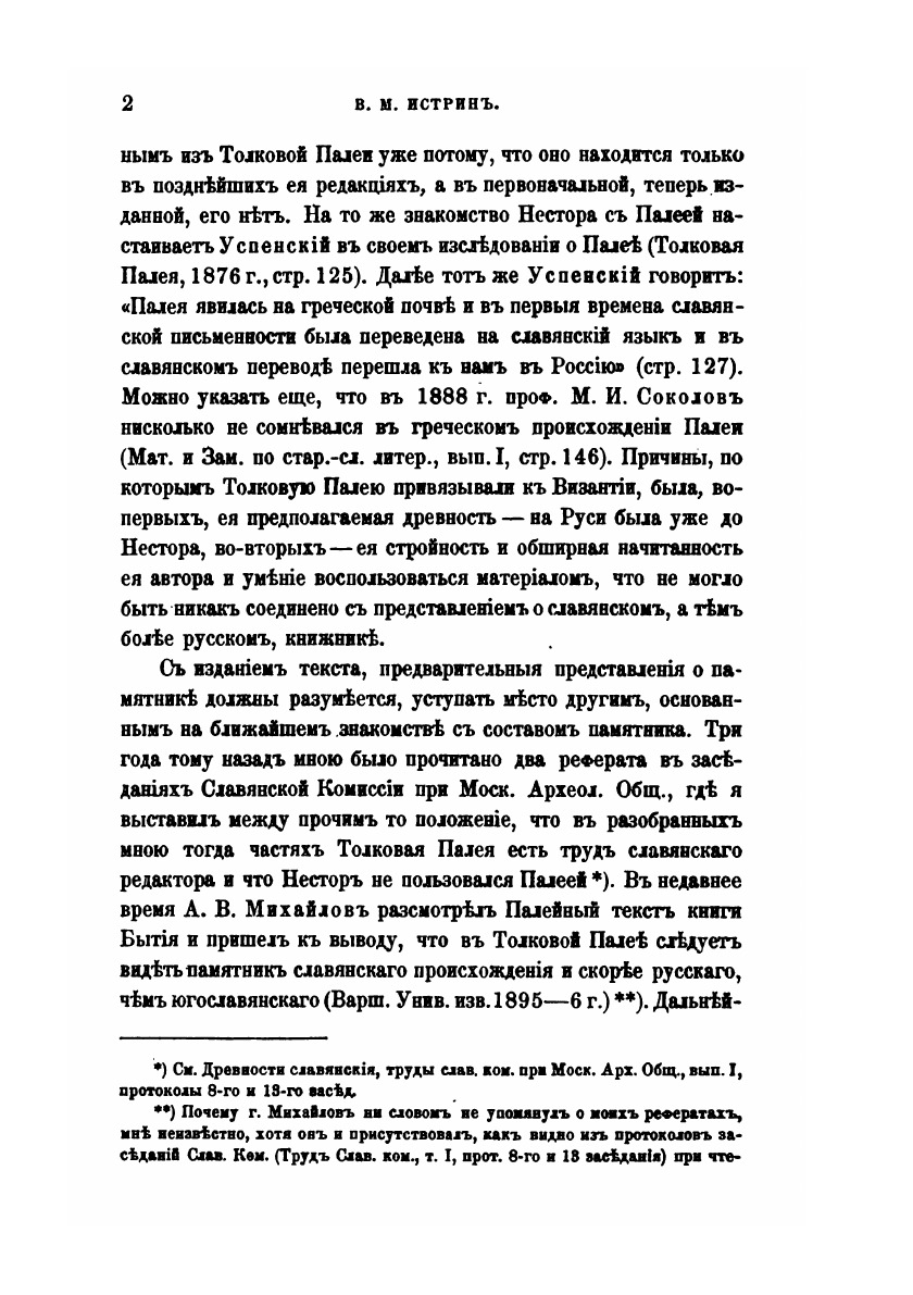 Первый шаг к разработке Толковой Палеи сделан: учениками покойного Н.С. Тихонравова докончено издание Палеи по Коломенскому списку 1406 г. Теперь настало время для исследования ее происхождения и истории. Толковая Палея считалась первоначально греческим памятником, переведенным где-нибудь на юге, вероятнее всего в Болгарии, и затем распространившееся у нас. Происхождение ее на Руси относилось к древнему времени: предполагалось, что уже Нестор пользовался ею.