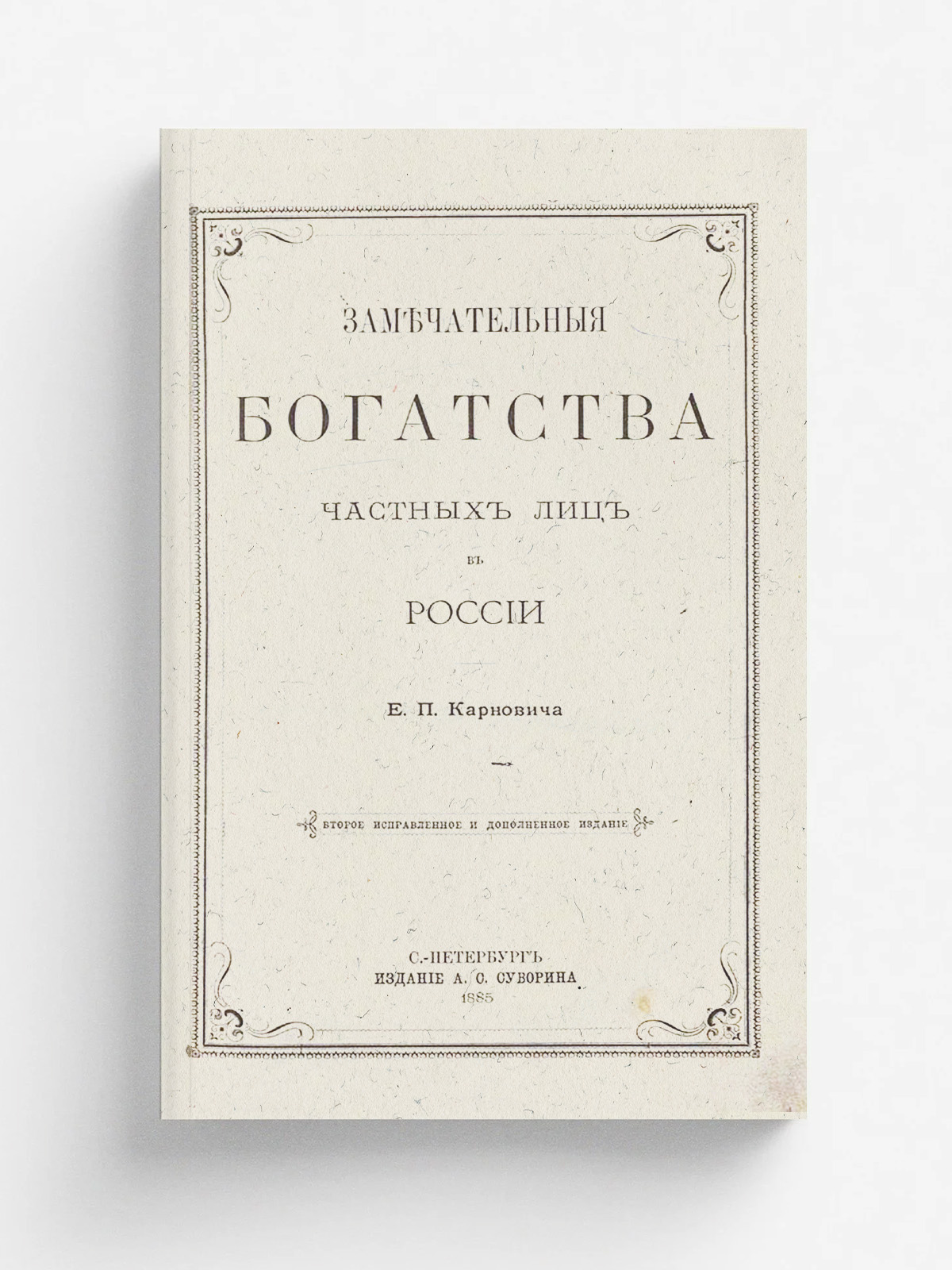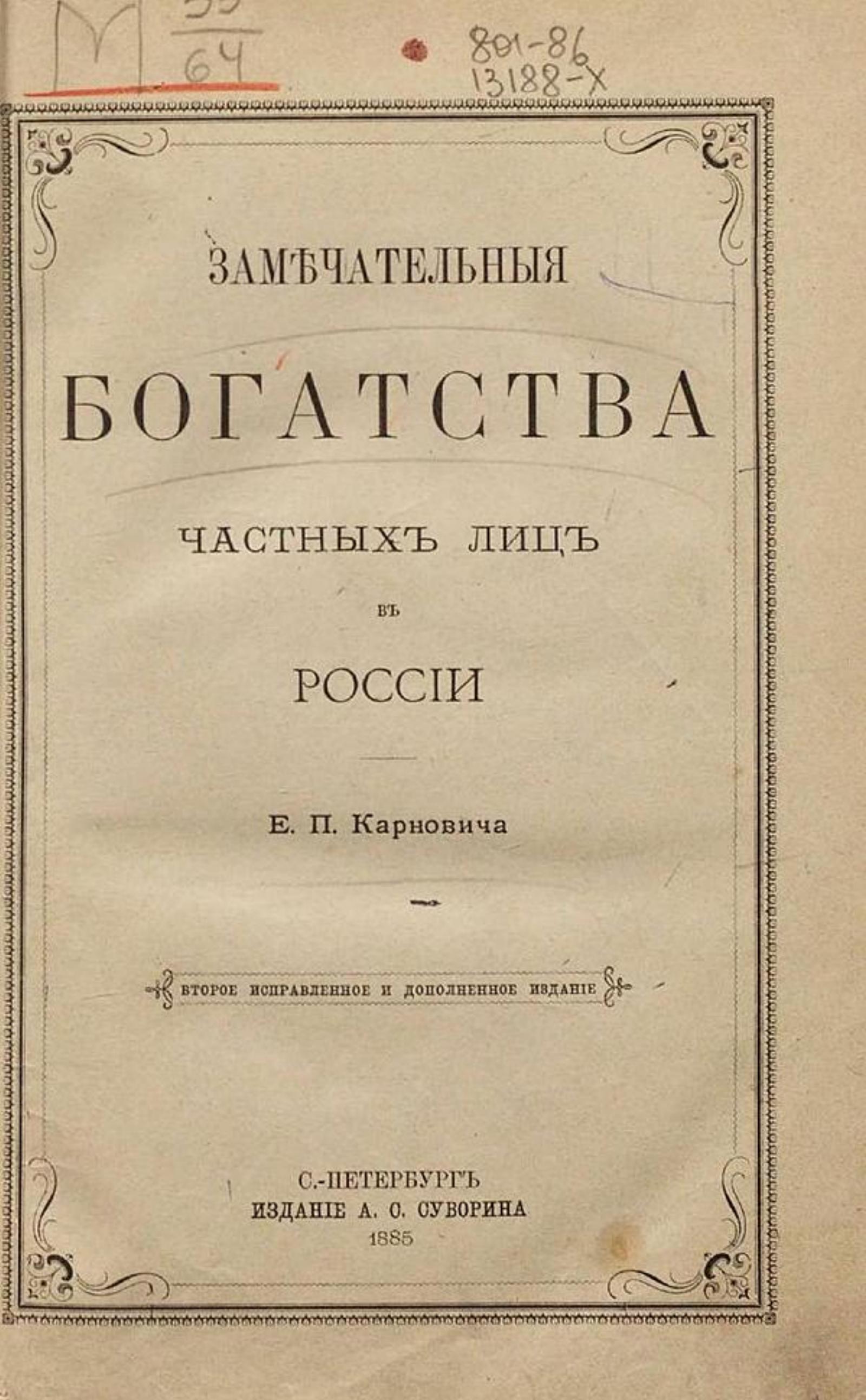 Карнович, Евгений Петрович (1824–1885). Замечательные богатства частных лиц в России. — 2-е изд., испр. и доп. — Санкт-Петербург : А. С. Суворин, 1885. — [2], VI, 330 с.; 22.