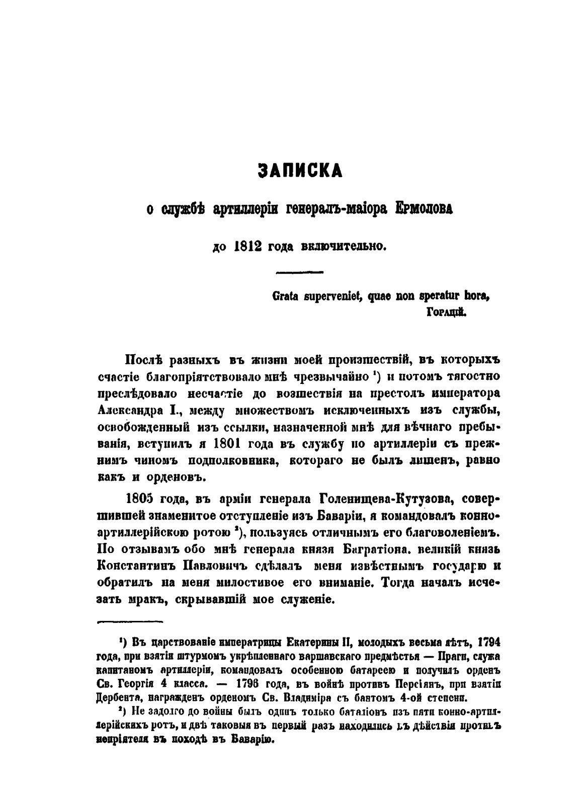 Алексей Петрович Ермолов (1772-1861) бесспорно принадлежит к числу выдающихся военных и государственных деятелей России. По отзыву декабриста М. Ф. Орлова, имя Ермолова «должно служить украшением нашей истории». Ермолов был непосредственным участником всех важнейших сражений и боев Отечественной войны 1812 года, как во время наступления французской армии, так и в период ее изгнания из пределов России. Особенно он отличился в сражениях при Витебске, Смоленске, Бородине, Малоярославце, Красном, Березине. С прибытием к соединенной армии М. И. Кутузова Ермолов становится начальником его штаба - в этой должности он находился вплоть до изгнания французов из пределов России. В своих мемуарных «Записках» Ермолов с документальной точностью описывает факты и события, и в этом особая ценность его «Записок» как исторического источника. Основой для «Записок» послужили дневники Ермолова, благодаря которым его воспоминания содержат «самые точные сведения, не подлежащие сомнению». Без привлечения «Записок» Ермолова не может обойтись ни один историк, исследующий Отечественную войну 1812 года. Как крупный военный деятель, Ермолов дает глубокий анализ военным действиям, его проницательный ум отразился в интересных и тонких наблюдениях событий, говоря его языком, «не до одного управления армии касающихся».