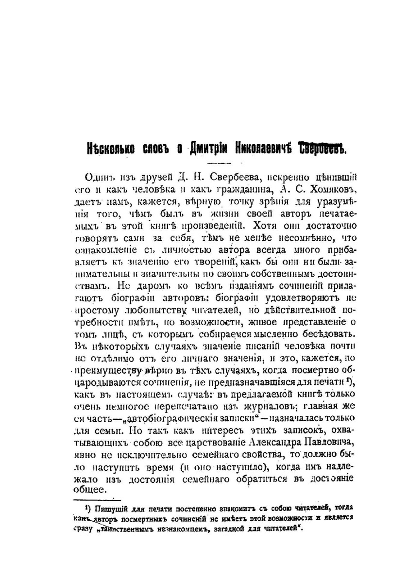 В 70 лет, живя на покое вдали от Москвы, в Швейцарии, Дмитрий Николаевич Свербеев, начал главное дело жизни, сам того не ведая. По его признанию, «без всяких притязаний на авторство и без нужды на успех», побуждаемый дочерью, стал диктовать воспоминания. Свои записки он предназначал для семьи, детей, многочисленных внуков. Заинтересовали мемуары читающую Россию. Перед собой Свербеев поставил цель сохранить в памяти образ старой Москвы, описать быт, нравы, привычки общества разных социальных слоев.Дмитрий Свербеев запечатлел в «Записках» выдающихся современников и «чудаков», «оригиналов», людей удивительных судеб. Ему хотелось показать «русского человека», «во всех его видах и со всеми качествами», «противоречиями». Что вполне ему удалось. В двух томах «Записки. 1799—1826» вышли в Москве, спустя четверть века после смерти автора, к столетию со дня его рождения в 1899 году.
