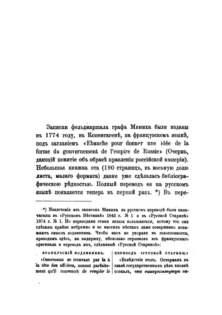 Записки графа Миниха, написанные им для Екатерины II и впервые изданные на французском языке в 1774 г. под названием Ebauche pour donner une idee de la forme du gouvernement de l'empire de Russie (Очерк, дающий понятие об образе правления Российской империи) быстро стали в России библиографической редкостью. Переводы отрывков из Записок публиковались в «Русском Вестнике» и «Русской старине», однако отличались значительными неточностями.Понадобилось сто лет, чтобы, наконец, было подготовлено добросовестное русское издание этого примечательного труда знаменитого полководца и государственного деятеля. Книга была выпущена под редакцией и примечаниями известного писателя-историка С.Н. Шубинскаго в задуманной им серии «Записки иностранцев о России в XVIII столетии» «Записки» охватывают период с 1720 по 1761 гг. и представляют собой свод описания личных качеств и образа правления государей от Петра Великого до Петра III. Ключевой мыслью сквозь все сочинение проходит идея о необходимость учреждения государственного совета для «наполнения пустоты между верховной властью и властью Сената».Достоинством издания 1874 года является обширный отдел примечаний, где дается исторический комментарий к тексту Миниха. В приложении книге помещены статьяМ.Д.Хмырова «Фельд-цейхмейстерство графа Миниха» и указатель опубликованных о федьдмаршале книг и статей.