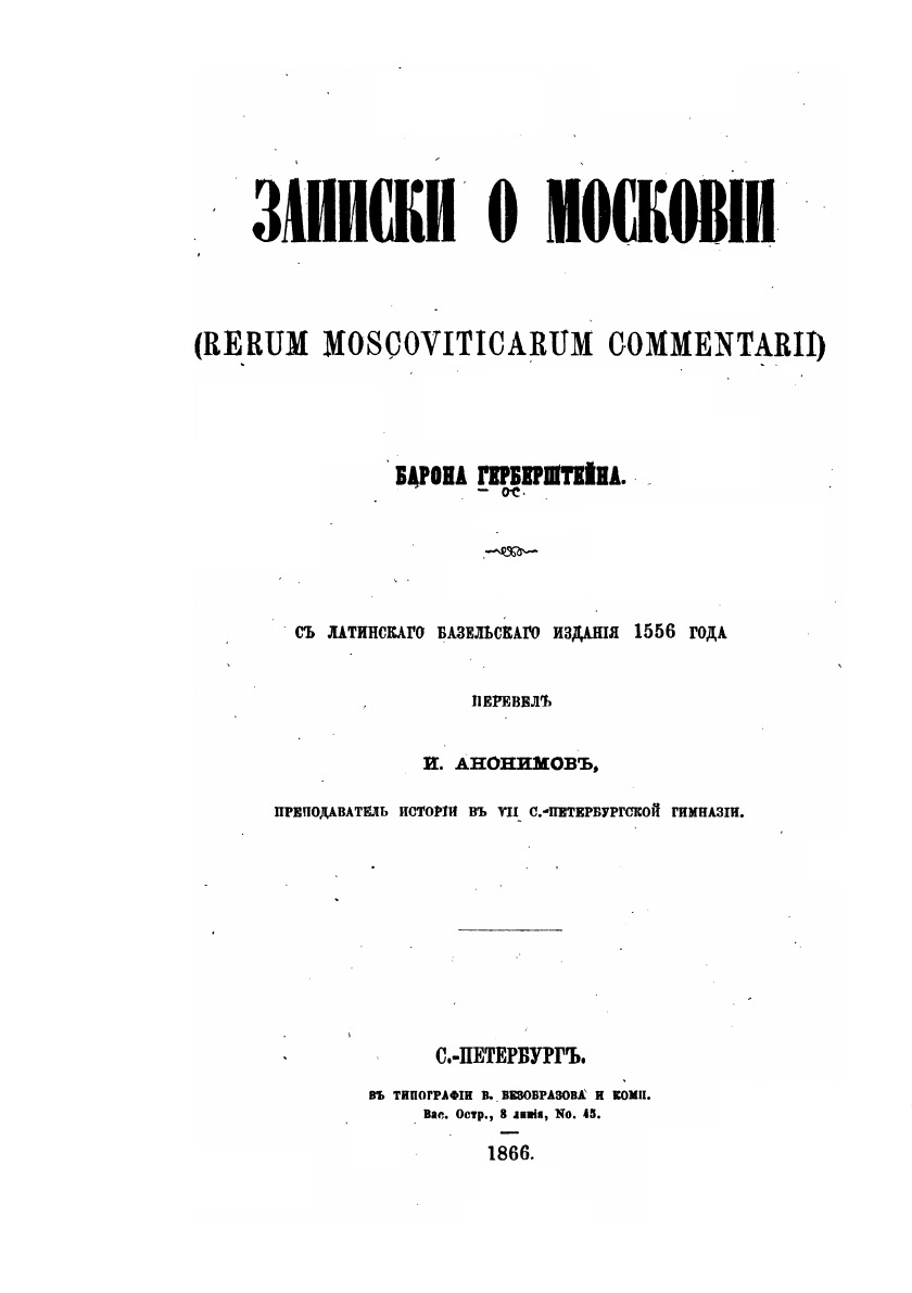 Описание: Австрийский дипломат Сигизмунд Герберштейн побывал в Москве в 1517 и 1526 гг. Герберштейн одним из первых рассказал европейскому читателю о жизни, нравах народов Руси. Ему удалось познакомиться с такими памятниками древнерус-ской письменности, которые не сохранились до наших дней и известны лишь в его переводах. Все это делает книгу ценнейшим историческим источником.
