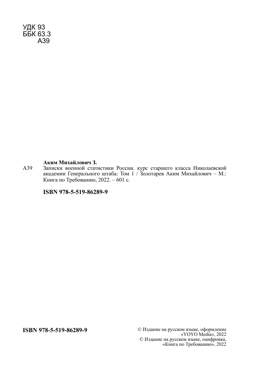 Печатная книга «Записки военной статистики России. курс старшего класса Николаевской академии Генерального штаба, Том 1» в мягкой обложке, язык - русский. В книге 601 страниц, она напечатана на белой офсетной бумаге плотностью 80 г/м². Формат издания — 148x210 мм. Все книги аккуратно упаковываем в прочный трёхслойный непрозрачный картонный конверт.