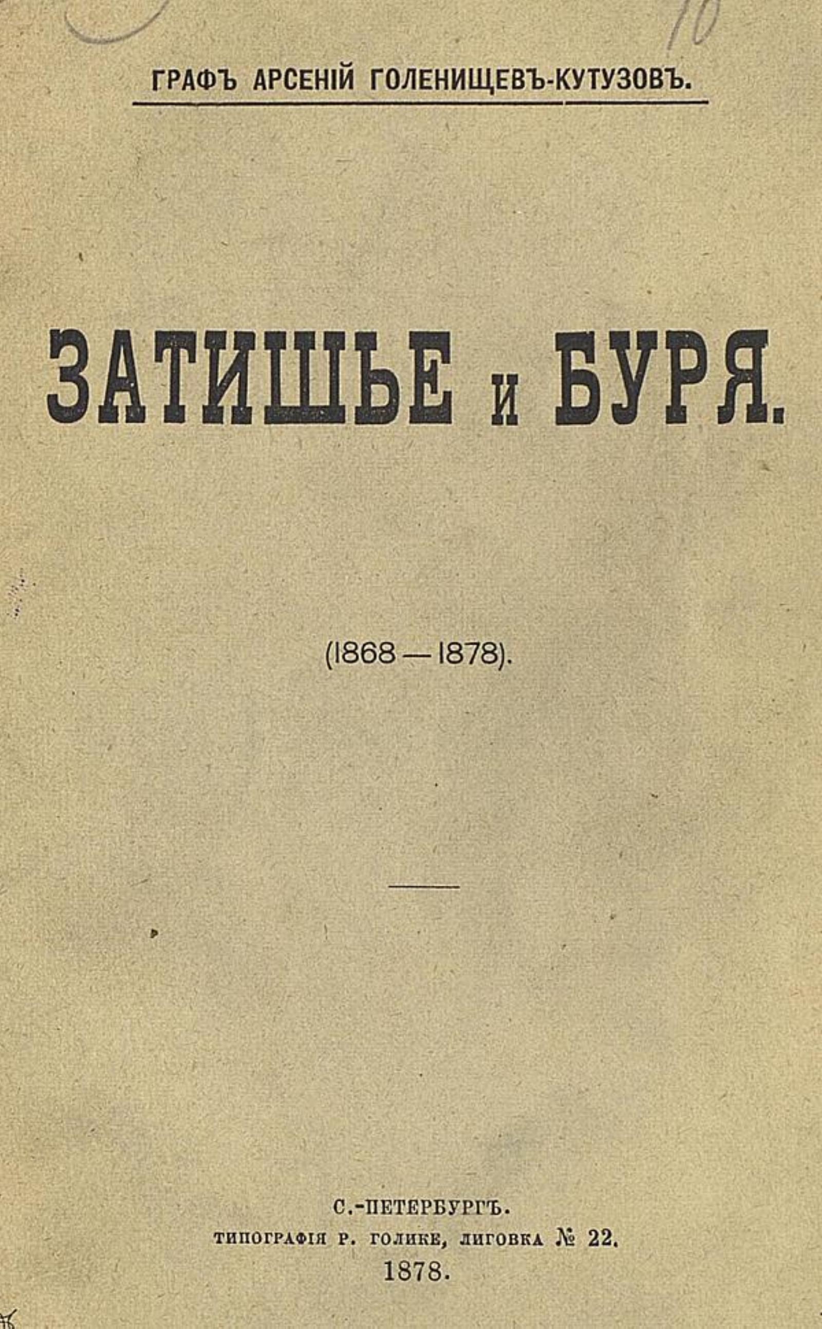 Голенищев-Кутузов, Арсений Аркадьевич (1848–1913). Затишье и буря : [Стихотворения] : (1868–1878) / [Гр. Арсений Голенищев-Кутузов]. — Санкт-Петербург : тип. Р. Голике, 1878. — 169 с.; 22.