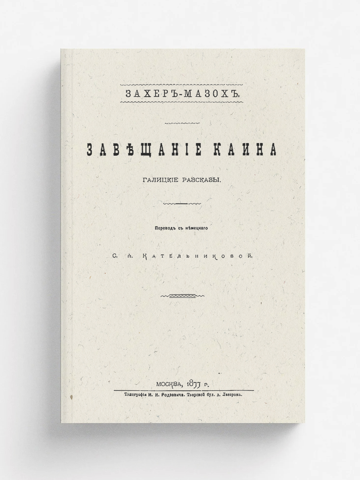 Захер-Мазох, Леопольд фон (1836-1895). Завещание Каина : галицкие рассказы / Захер-Мазох ; пер. с нем. С. А. Кательниковой. — Москва : Тип. И. И. Родзевича, 1877. — 324, [1] с.; 23 см.