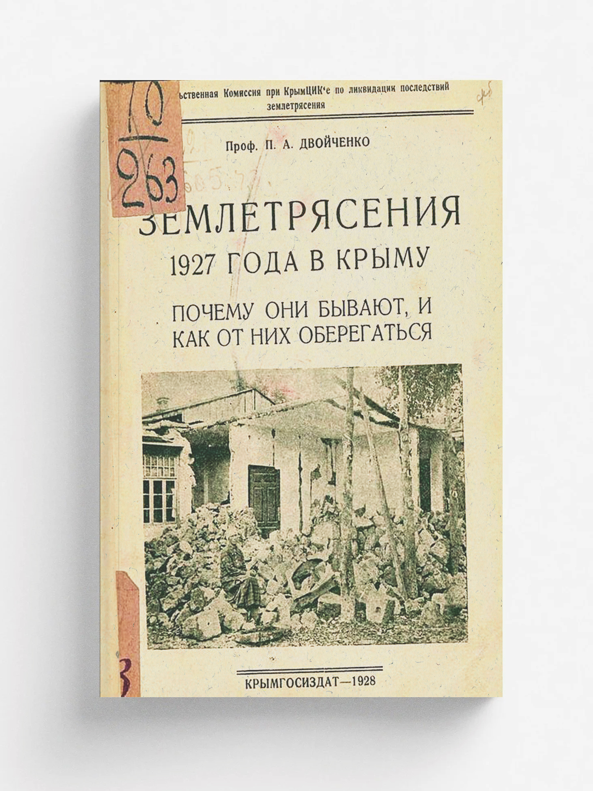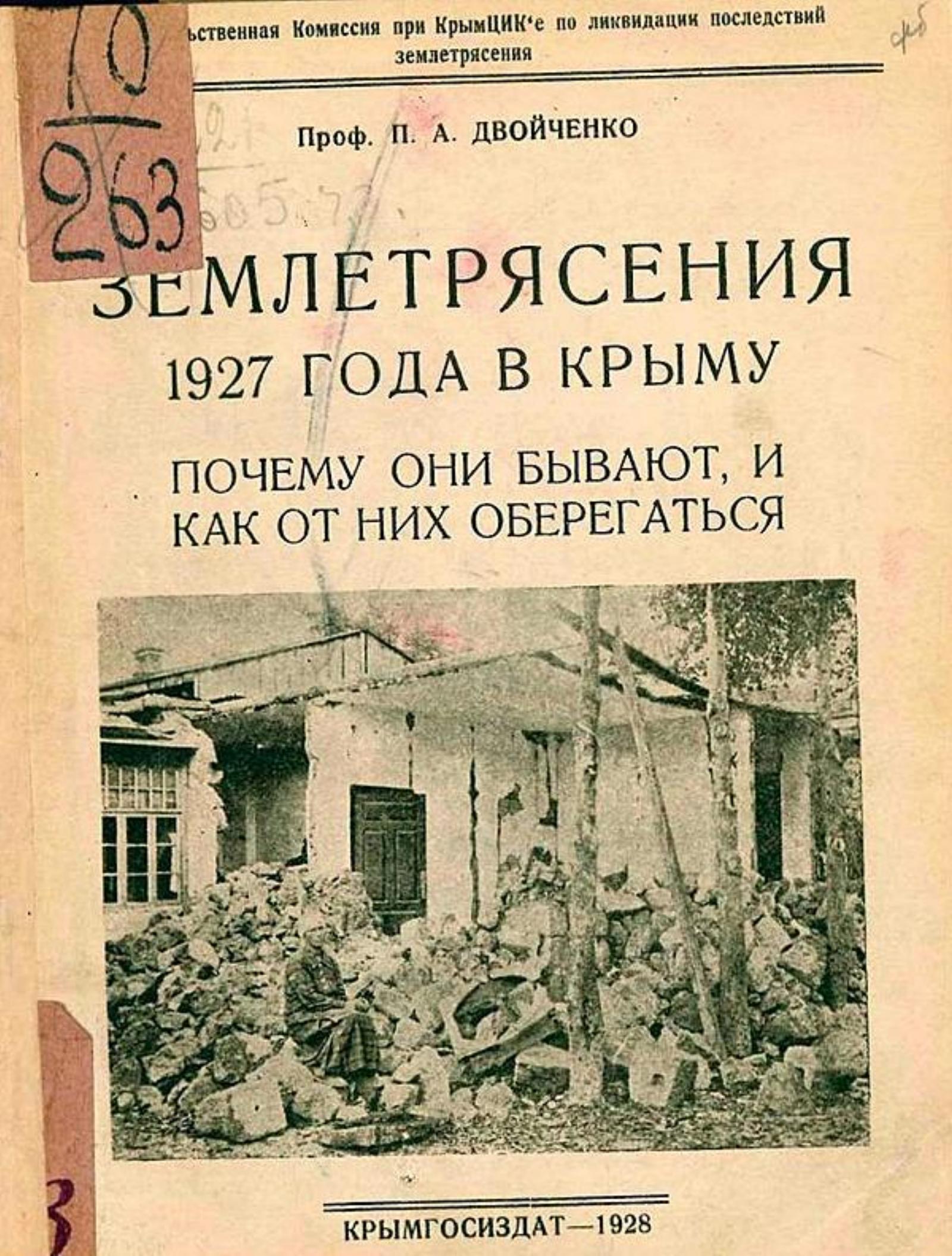 Двойченко, Петр Абрамович. Землетрясения 1927 года в Крыму. Почему они бывают, и как от них оберегаться (Очерк для деревни с 9 фотогр.) / Проф. П. А. Двойченко; Правительства комис,.: при Крым Цике по ликвидации последствий землятресения; Предисловие: М. Кубаев. — [Симферополь]: Крымгосиздат, 1928. — 72 с. : ил.; 18 см.