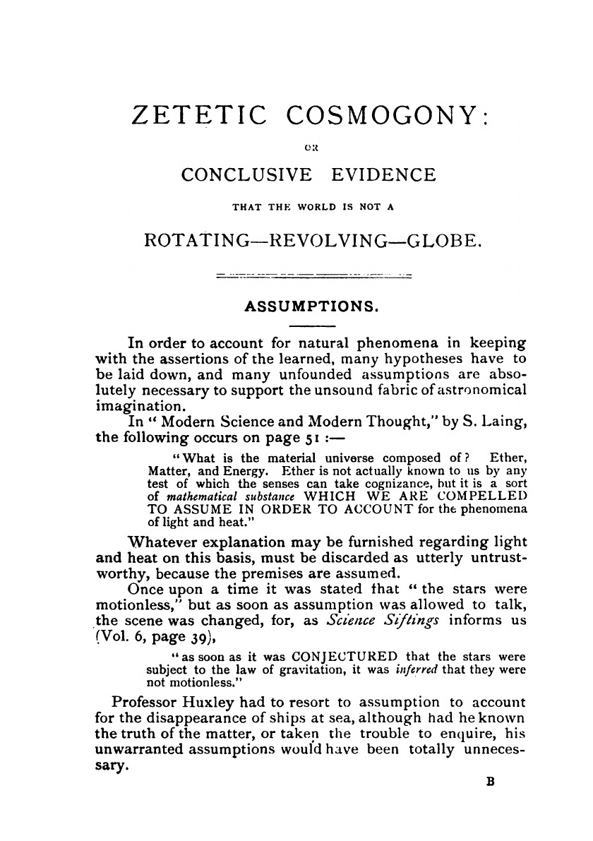 Zetetic cosmogony, or, Conclusive evidence that the world is not a rotating-revolving-globe, but a stationary plane circle.