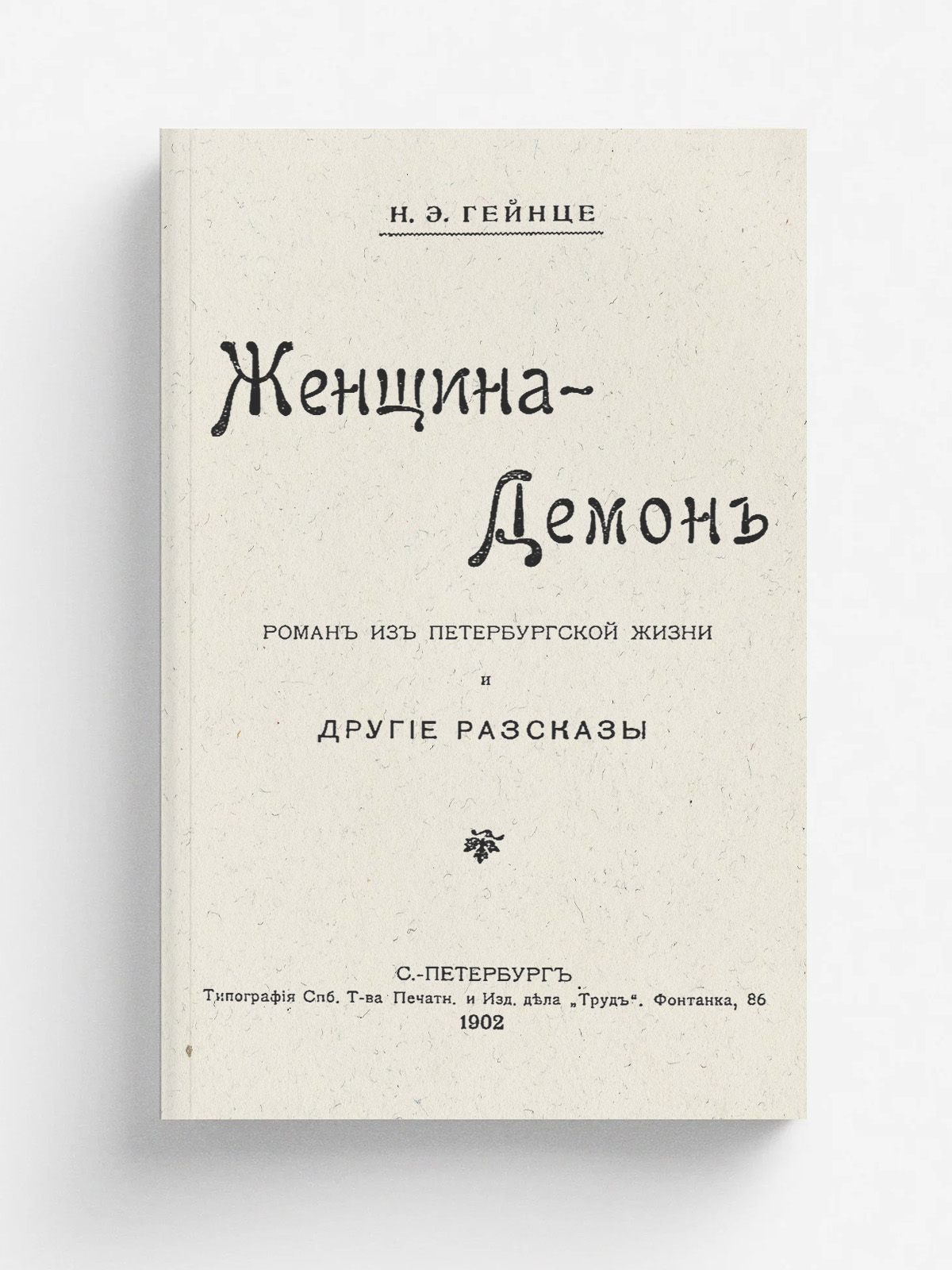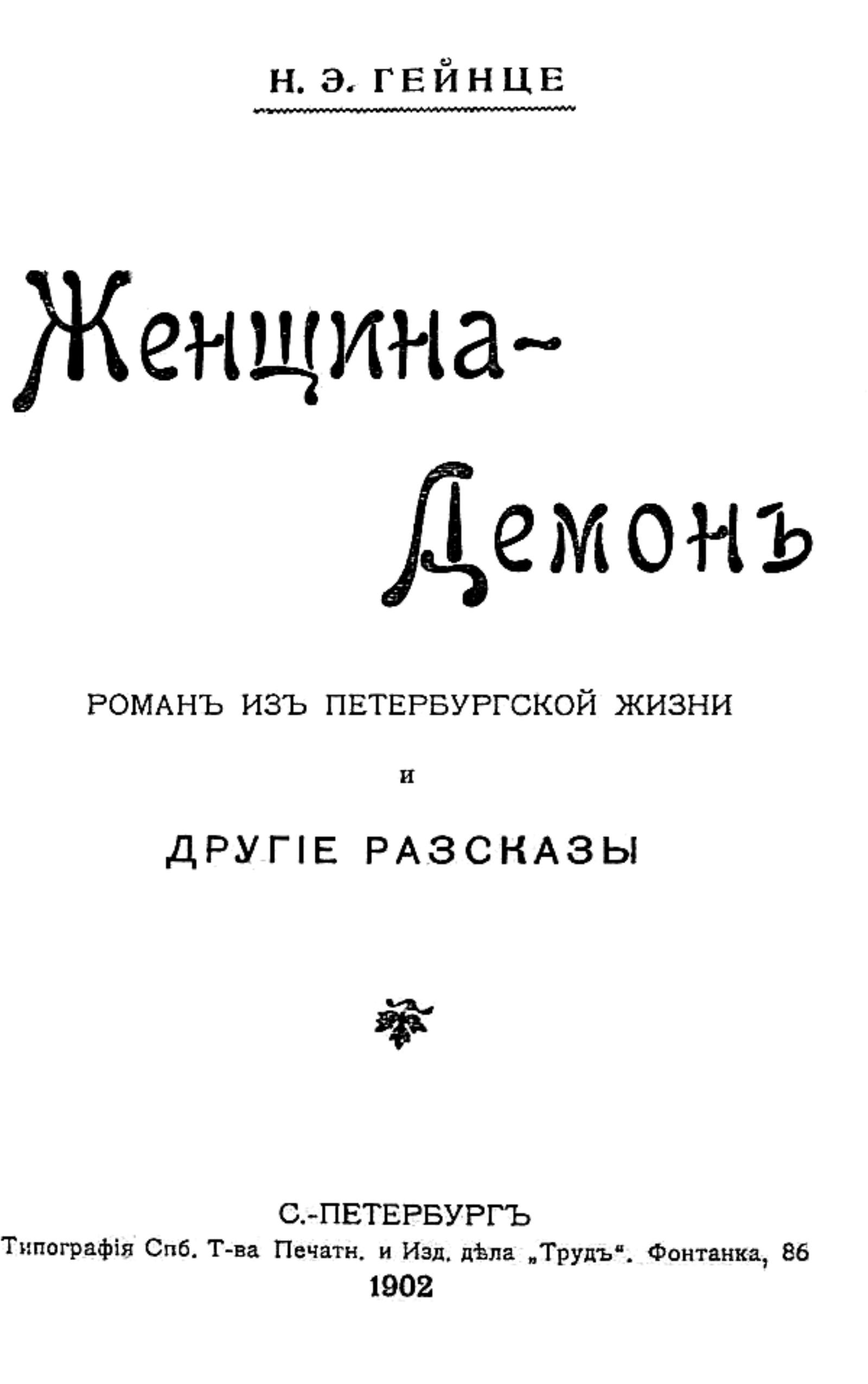 Гейнце, Николай Эдуардович (1852–1913). Женщина-демон : Роман из петерб. жизни и др. рассказы / Н. Э. Гейнце. — Санкт-Петербург : тип. Спб. т-ва печ. и изд. дела «Труд», 1902. — [2], 270 с.; 18.