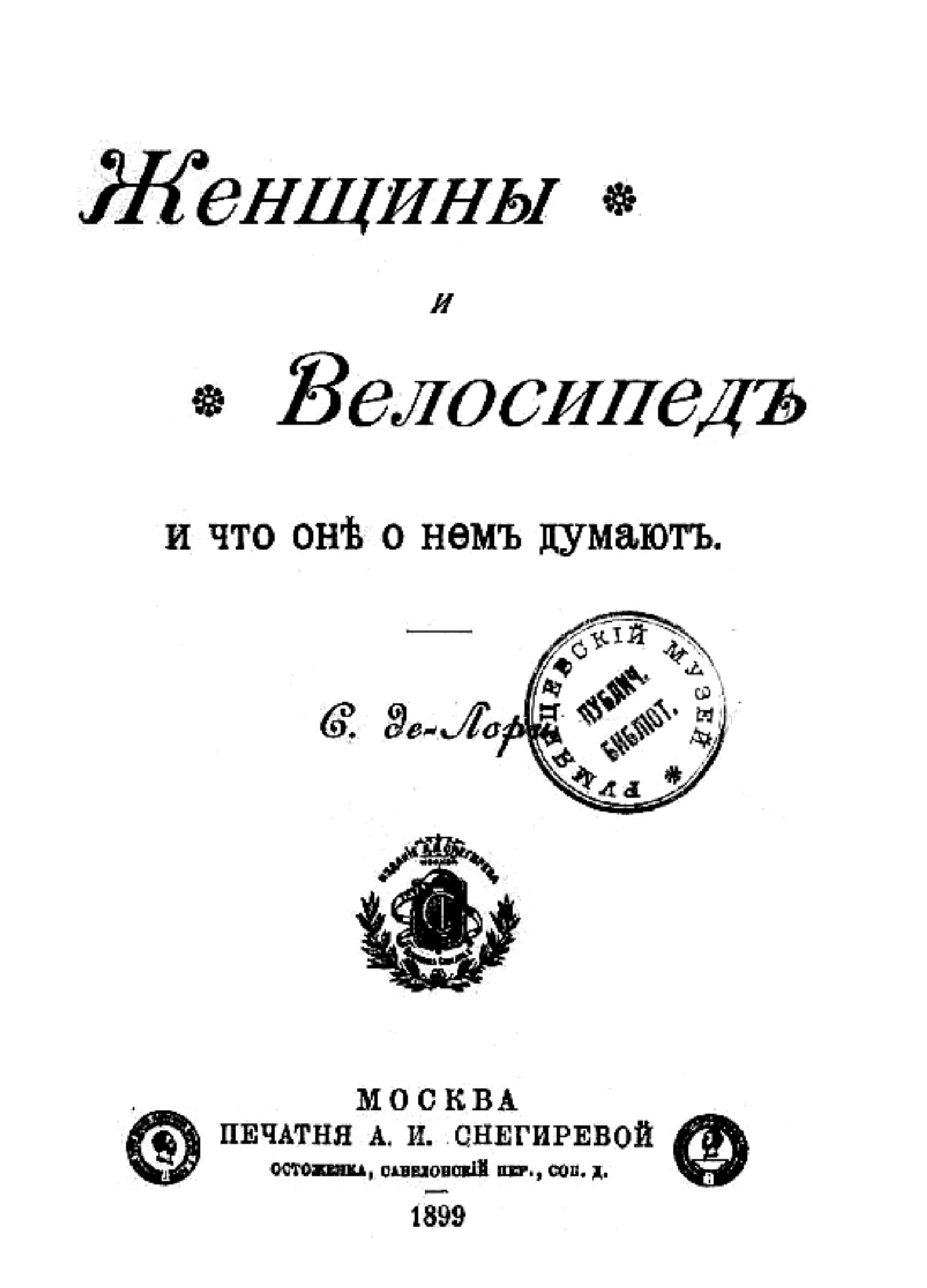Лорис, С. де. Женщины и велосипед и что они о нем думают / С. де-Лори. — Москва : Л. Л. Снегирев, 1899. — 44 с. : ил.; 20.