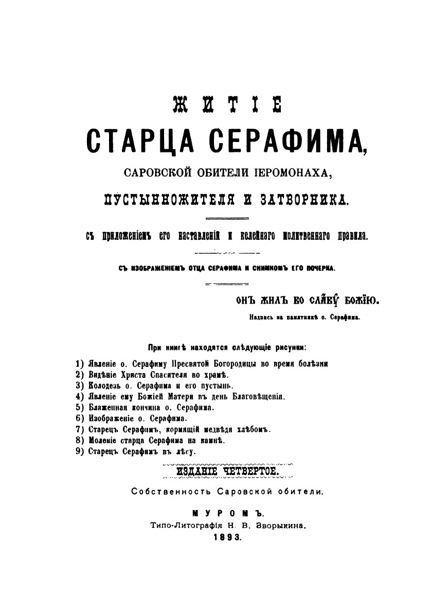 Эта книга — репринт оригинального издания (издательство "Саровская пустынь", 1893 год), созданный на основе электронной копии высокого разрешения, которую очистили и обработали вручную, сохранив структуру и орфографию оригинального издания. Редкие, забытые и малоизвестные книги, изданные с петровских времен до наших дней, вновь доступны в виде печатных книг.