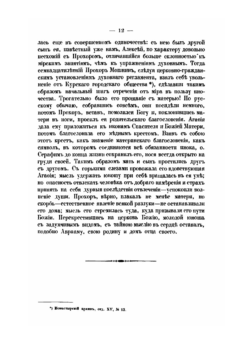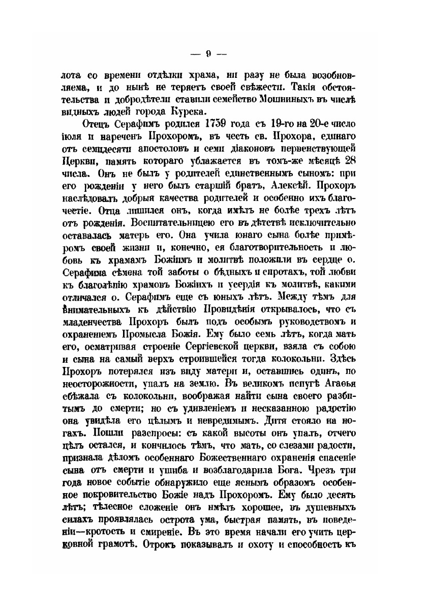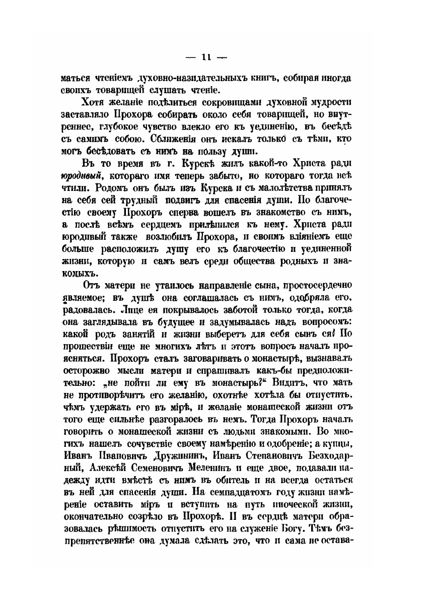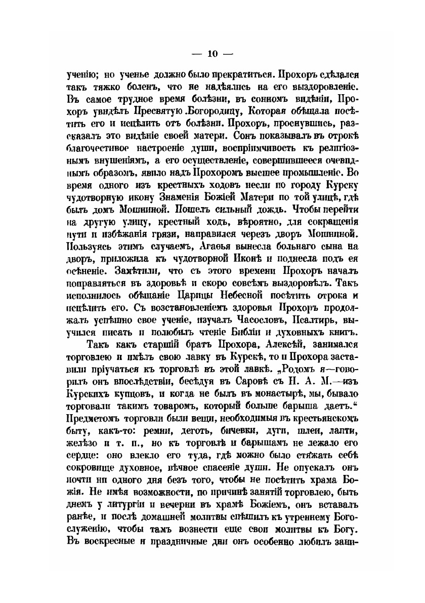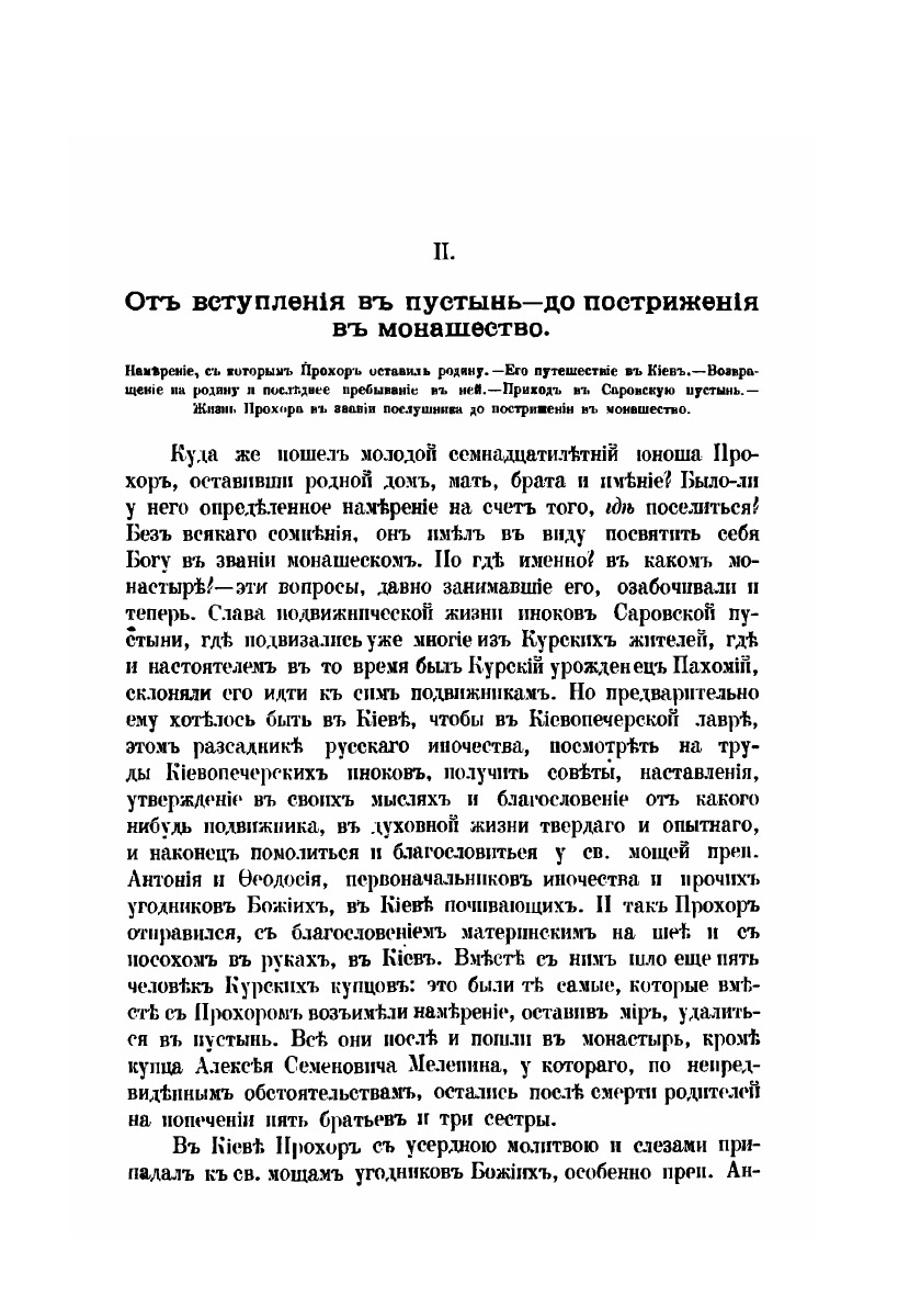 За долго до блаженной кончины старца Серафима, иеромонаха Саровской пустыни, подвижническая жизнь его была известна не только в Pocсиu, но за пределами нашего отечества по всей Православной Церкви. Приняв ангельский образ на 19-м году жизни, от почти пятьдесятъ пять лет жил безвыходно в Саровской пустыне и прожил там все степени подвижничества: нес сперва общия послушания монастырские, потом послушаниия по званиям иеродиакона и иеромонаха, подвизался в отшельничестве, подражал столпникам, быль молчальником и жил в совершенном затвортве. Среди этих разнообратых подвигов, сохраняя дух глубокого смирения, он стяжал богатство добродетели и обликдаров благодати божией.
