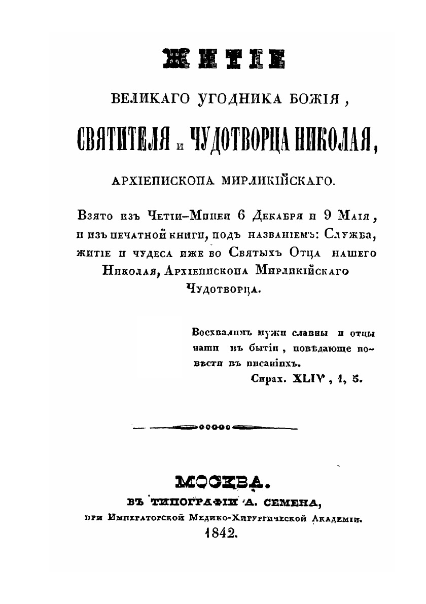 Житие великого угодника божия, святителя и чудотворца Николая, архиепископа Мирликийского, взятое из Четии-Минеи 6 декабря и 9 мая, и из книги: Служба, житие и чудеса иже во святых отца нашего Николая.