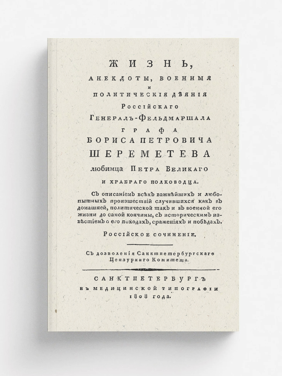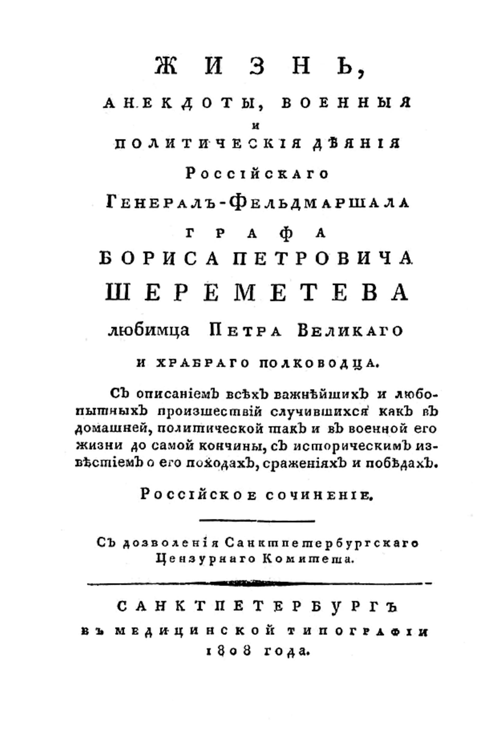 Лёвшин, Василий Алексеевич (1746-1826). Жизнь, анекдоты, военные и политические деяния российского генерал-фельдмаршала графа Бориса Петровича Шереметева любимца Петра Великого и храброго полководца. : С описанием всех важнейших и любопытных происшествий случившихся как в домашней, политической так и в военной его жизни до самой кончины. : С историческим известием о его походах, сражениях и победах. : Российское сочинение. — Санктпетербург : В Медицинской типографии, 1808. — 207, [1] с., [1] л. портр.; 8° (23 см.).