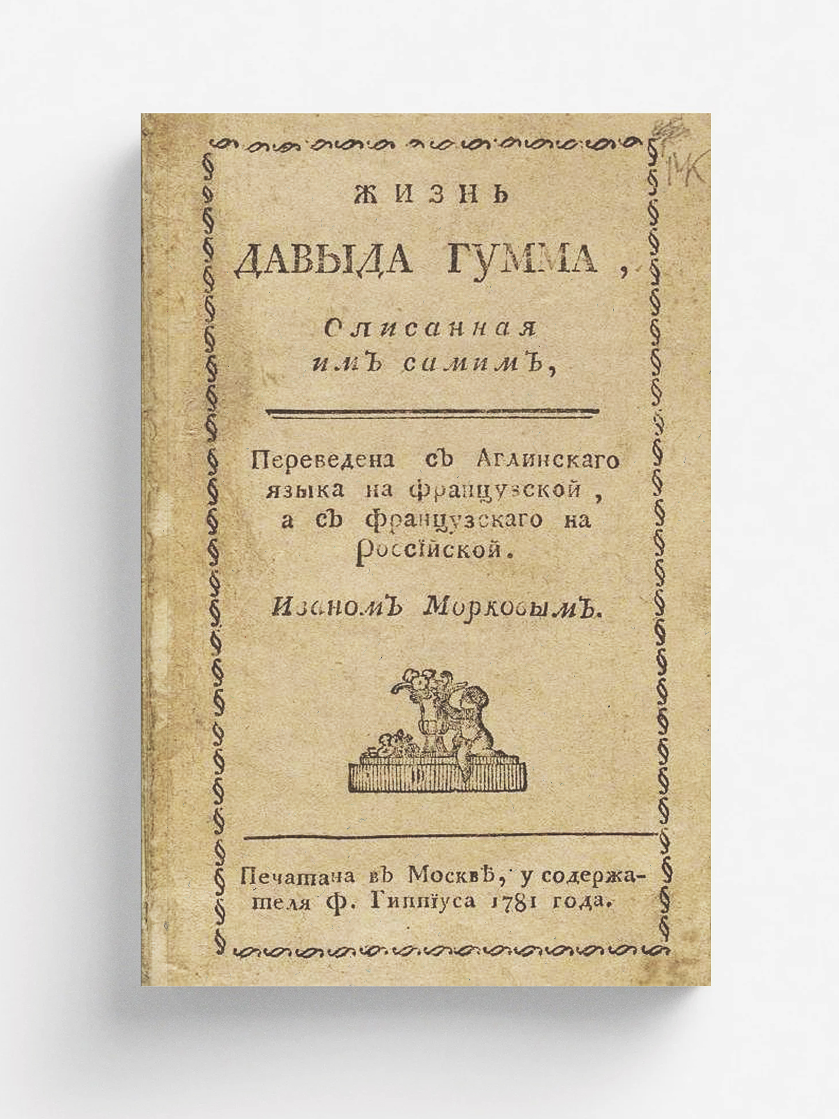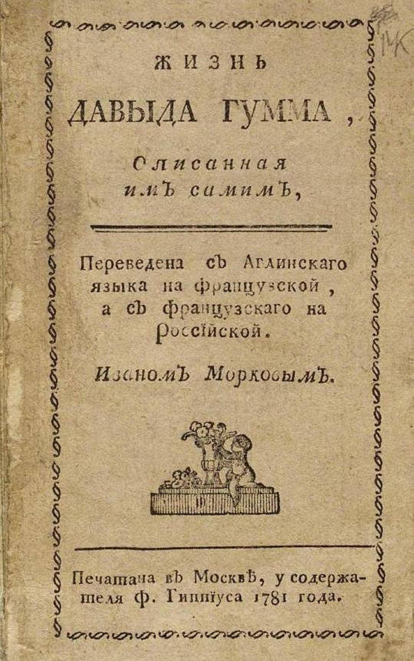 Юм, Давид. Жизнь Давыда Гумма, описанная им самим, : Переведена с аглинскаго языка на французской, / А с французскаго на российской. Иваном Морковым. — Москва : [Сенат. тип.], у Ф. Гиппиуса, 1781. — [5], 54 с.; 12°.