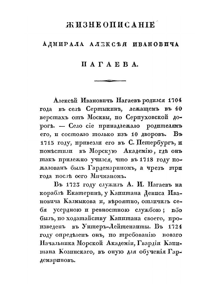 Собирая материалы для составления первого Берингова путешествия, нашел я весьма много любопытных бумаг собственной руки Алексея Ивановича Нагаева. Наслышавшись до сего только поверхностно о деяниях сего почтенного мужа, пришел я в удивление, когда усмотрел, в каких беспрерывных и полезных трудах провел он всю жизнь свою.