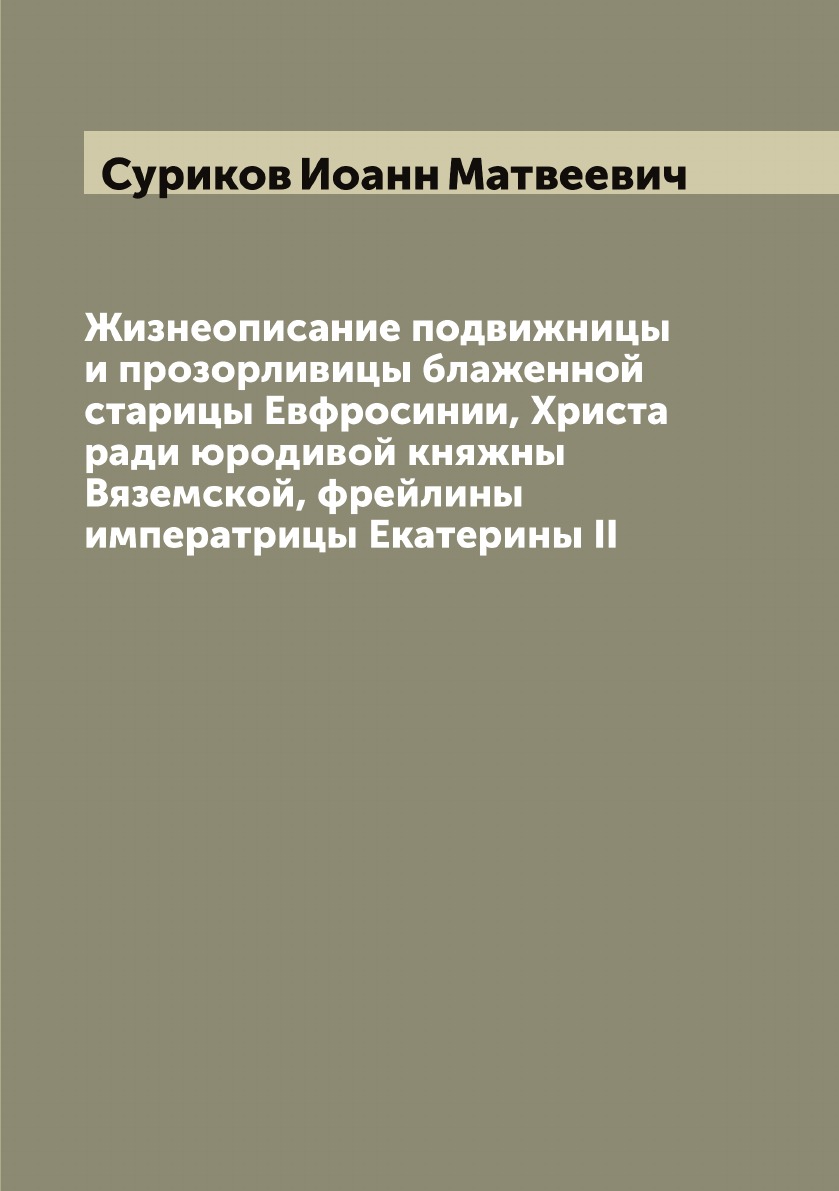 Печатная книга «Жизнеописание подвижницы и прозорливицы блаженной старицы Евфросинии, Христа ради юродивой княжны Вяземской, фрейлины императрицы Екатерины II» в мягкой обложке, язык - русский. В книге 86 страниц, она напечатана на белой офсетной бумаге плотностью 80 г/м². Формат издания — 148x210 мм. Все книги аккуратно упаковываем в прочный трёхслойный непрозрачный картонный конверт.