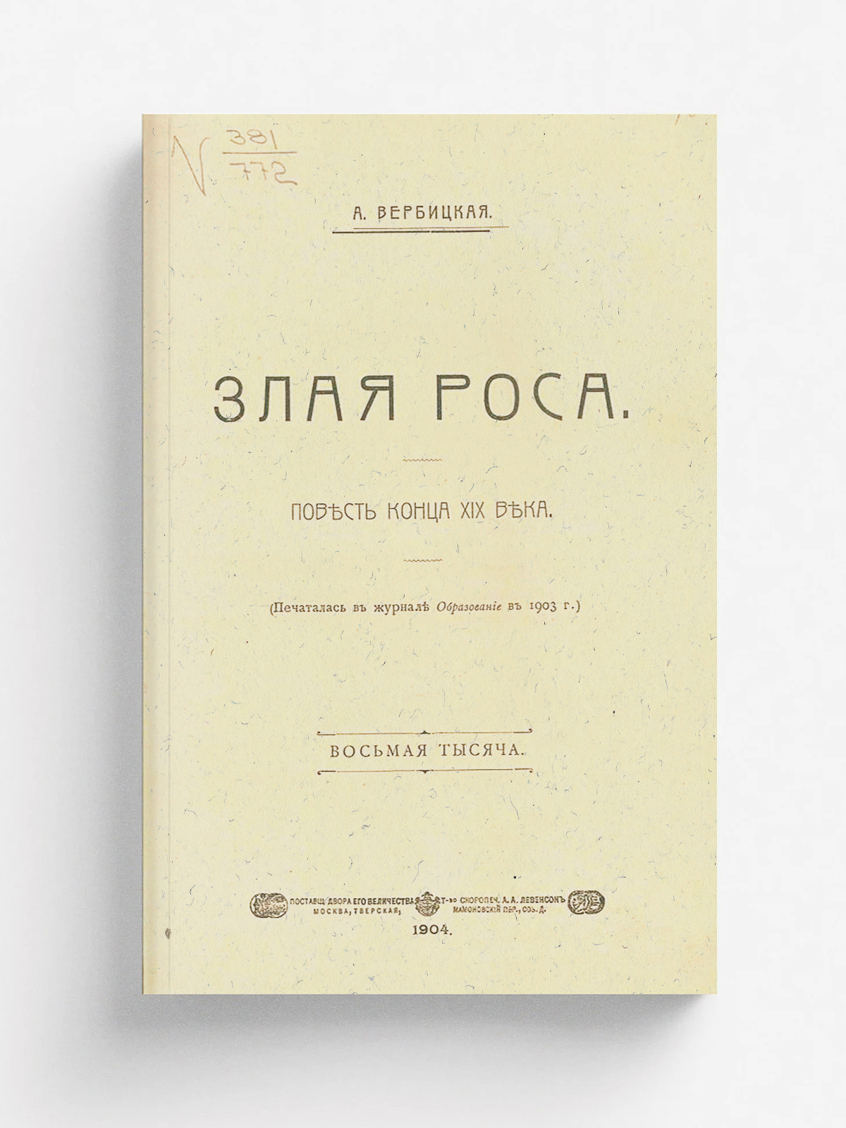 Вербицкая, Анастасия Алексеевна (1861–1928). Злая роса : Повесть конца XIX в. / А. Вербицкая. — 1-я тысяча. — Москва : т-во скоропеч. А. А. Левенсон, 1904. — 212, [3] с.; 22.