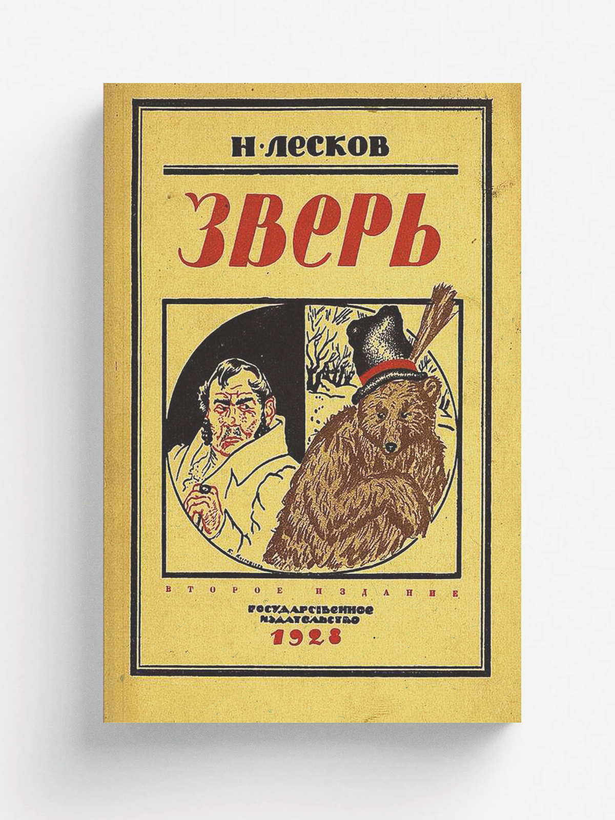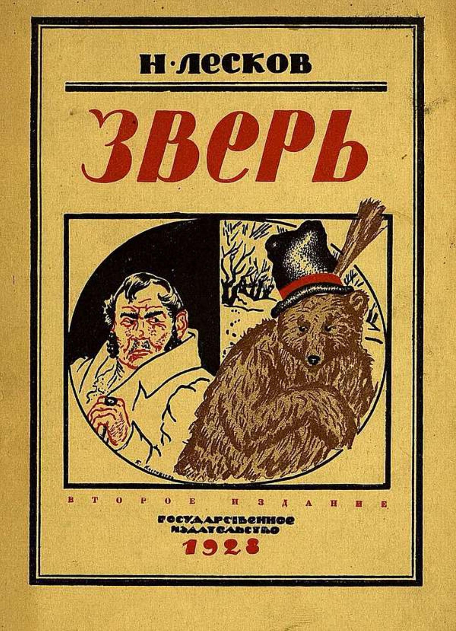 Лесков, Николай Семенович. Зверь [Текст] / Н. Лесков ; Рассказ в переработке Н. Жбанковой ; Рис. Б. Кустодиева ; Обложка: Б. Кустодиев. — 2-е изд. — Москва ; Ленинград : Гос. изд-во, 1928 (Л. : тип. Печатный двор). — 48 с. : ил.; 17?13 см. — (Для детей среднего и старшего возраста).
