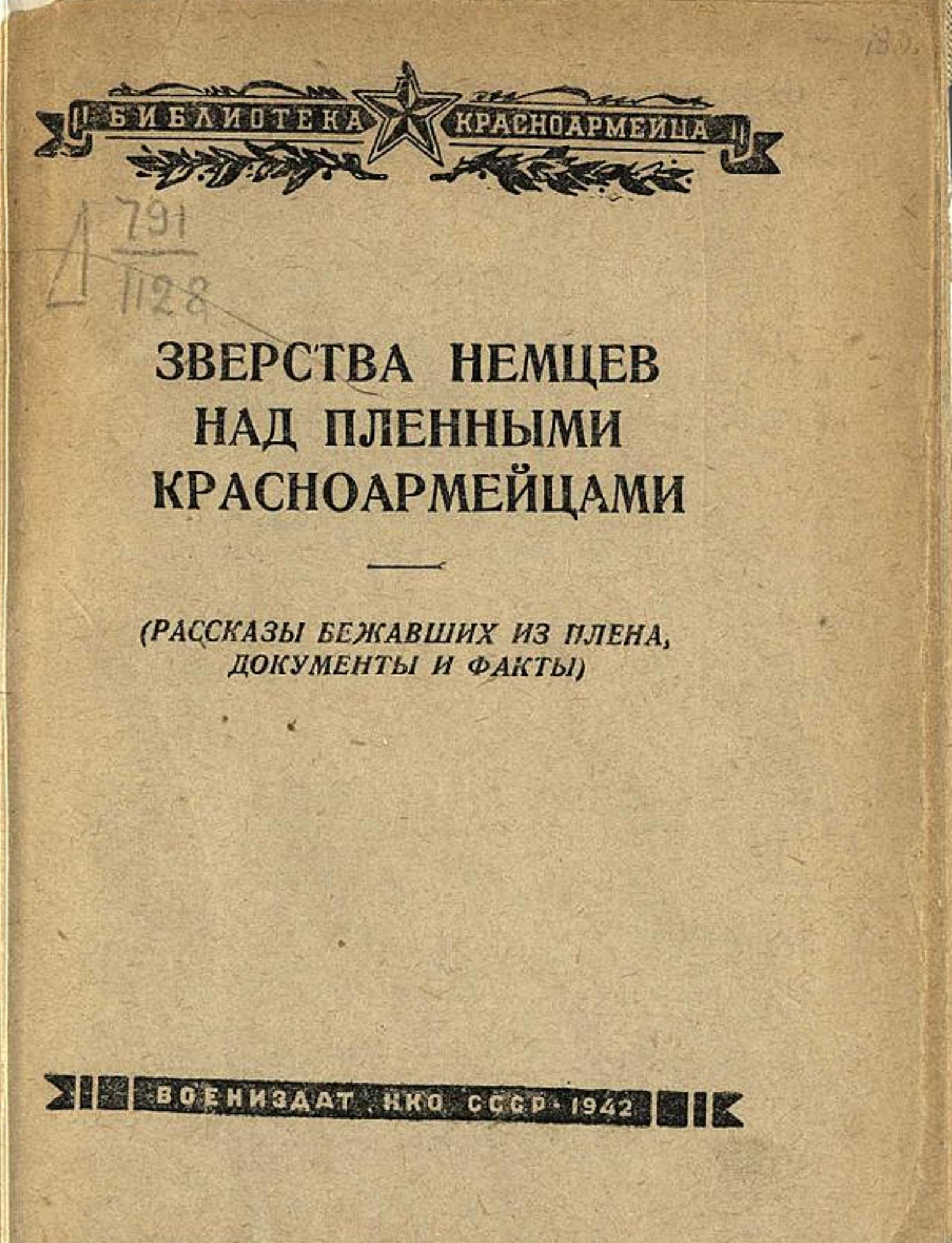 Зверства немцев над пленными красноармейцами (Рассказы бежавших из плена, документы и факты). — Москва : Воениздат, 1942. — 62 с. : ил.; 14 см. — (Библиотека красноармейца).